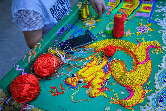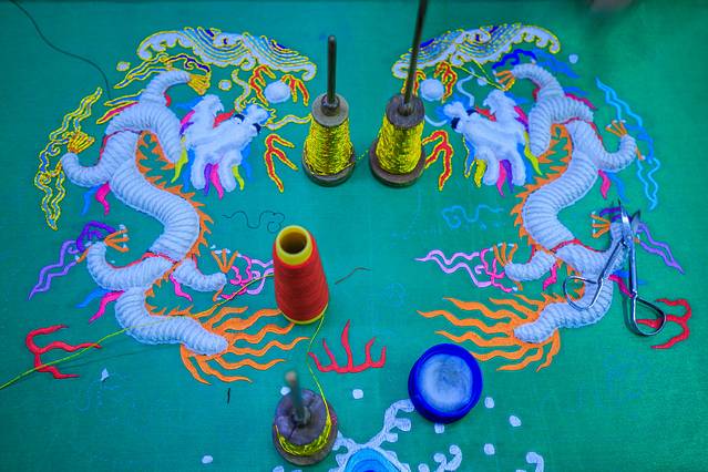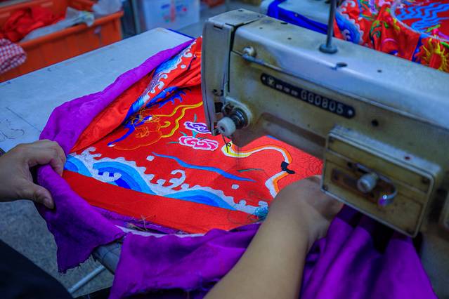 一块砖瓦还原一段历史,一句题跋叙说一段典故。在 泉州 ,出名的不止是工业,还有文化。林秀清大师工作室就位于此,300多平方米的工作室里摆放着6台木框绣架,一侧还摆放着几台电动缝纫机,还有一个房间专门陈列着完工的绣品,这种几乎由纯手工制作出来的绣品也被称为“金苍绣”,在这里还意外的见到不少闽南节日才会出现的电音三太子,憨态可掬的造型惟妙惟肖。