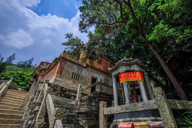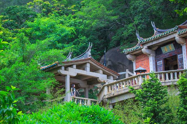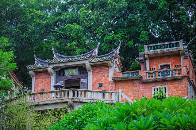 悬在岩壁上的三开间小石室,典型的闽南红砖外墙,不大却精巧,坐北朝南的石构红砖建筑,成了万绿丛中的“一点红”。