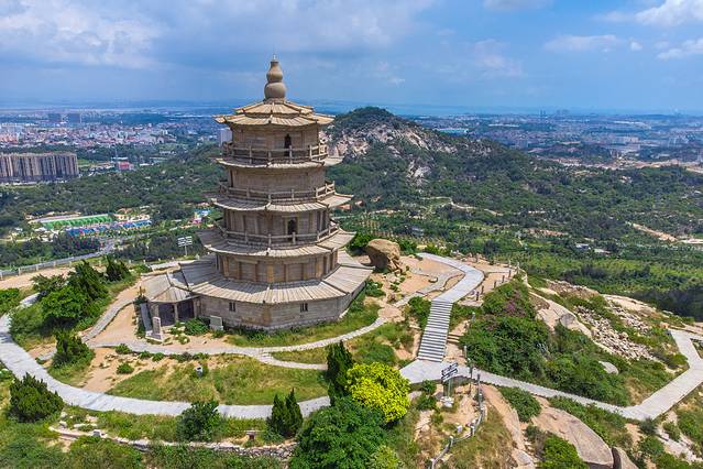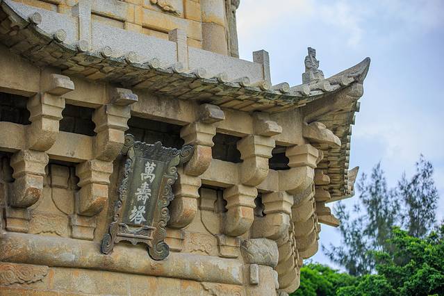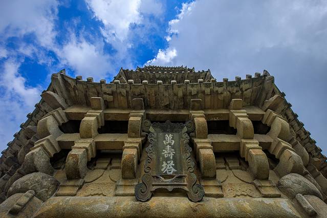 万寿塔同样选用花岗岩砌筑,为五层八角空心楼阁式塔,塔身为空心筒构造,八角形塔心室上达塔顶。