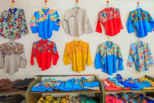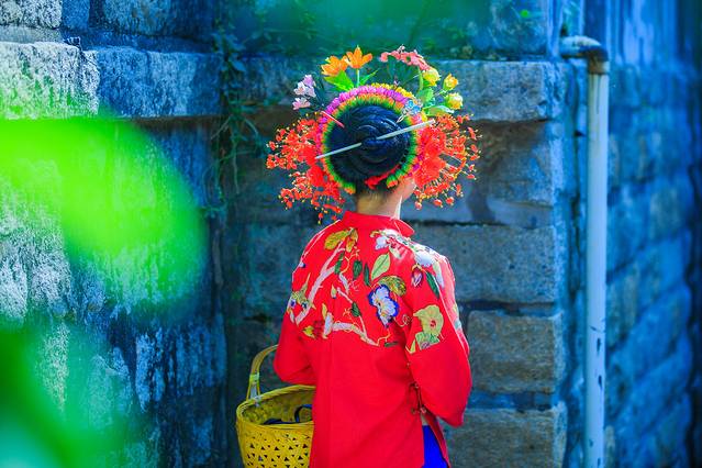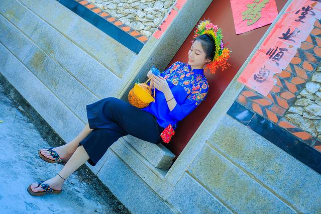 惠安 女独特的风情在于她的奇异的服饰,无穷的魅力,给人以视觉上巨大冲击。当你看见带着橙黄色斗笠,头巾上有着鲜艳的色彩与花纹,上面穿着短短紧紧的衣服,不管严寒酷暑总是露出肚脐,下面穿着宽松的裤子,围着银色的长腰带,那便是 惠安 女。她们的服装之所以衣服短,是怕在劳作时,被海水弄湿了衣服,裤脚宽,是因为能再海水弄湿后尽快的被海风吹干,独树一帜且有浓重的传统韵味,也带有现代气息。园中的茶馆,能让游客们亲身换上惠女的日常着装,并且价格不贵,花费20元即可体验惠女的装扮。
