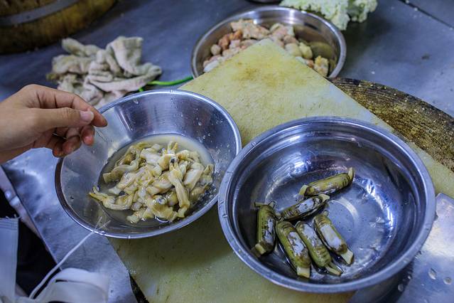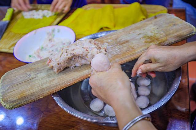 水丸汤看起来虽普通,但是制作工艺同样并非那么简单!最为重要的原料当然必须新鲜,都是选用刚上岸的鳗鱼或鲨鱼肉制作而成,经过耐心的刮取,才能获得最劲道的肉泥。而每一个水丸都是从有着数年制作经验的店员指缝间挤压出来,纯手工制作,没有任何添加剂,最大限度保证了食材的口感和新鲜程度。