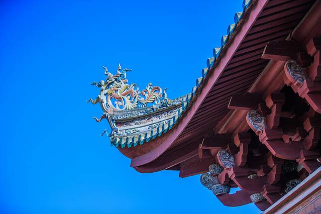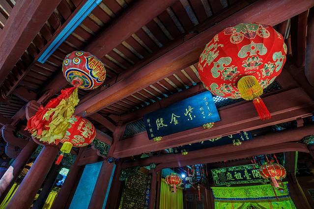 天后正殿,虽历经沧桑,但明清木构建筑至今依旧保存完好,殿内木梁骨架,立于圆形花岗岩 石柱 ,柱头浮雕仰莲连珠斗,挑出斗拱承托梁架作九架粱,建筑结构比较特别,空间变化很丰富,门窗弯枋雀替,雕花精致细密,纹饰丰富多彩。