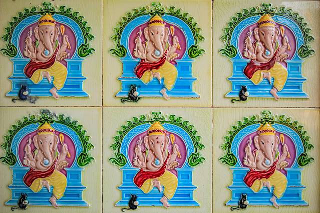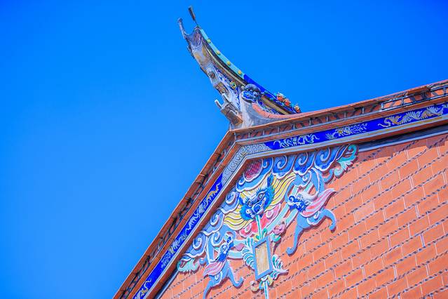 传统的砖雕配上南洋的特色瓷砖,最有特色的就数这些进口瓷砖上印有 印度 教色彩的“象头人身”图案,至今鲜艳如新,据说这就是 印度 神教中的象头神。