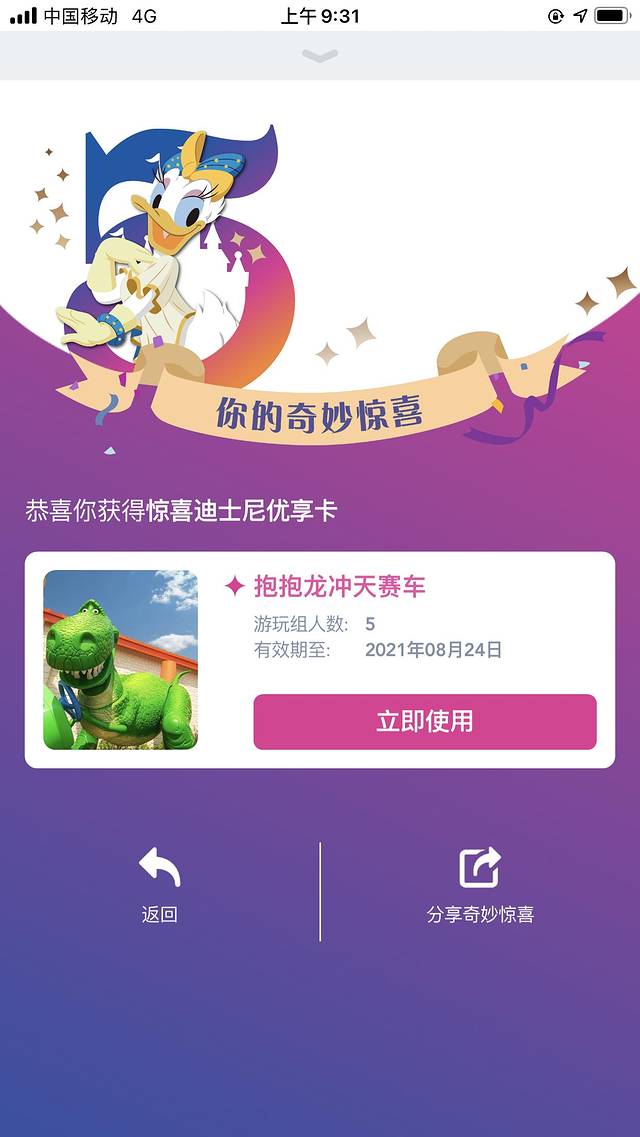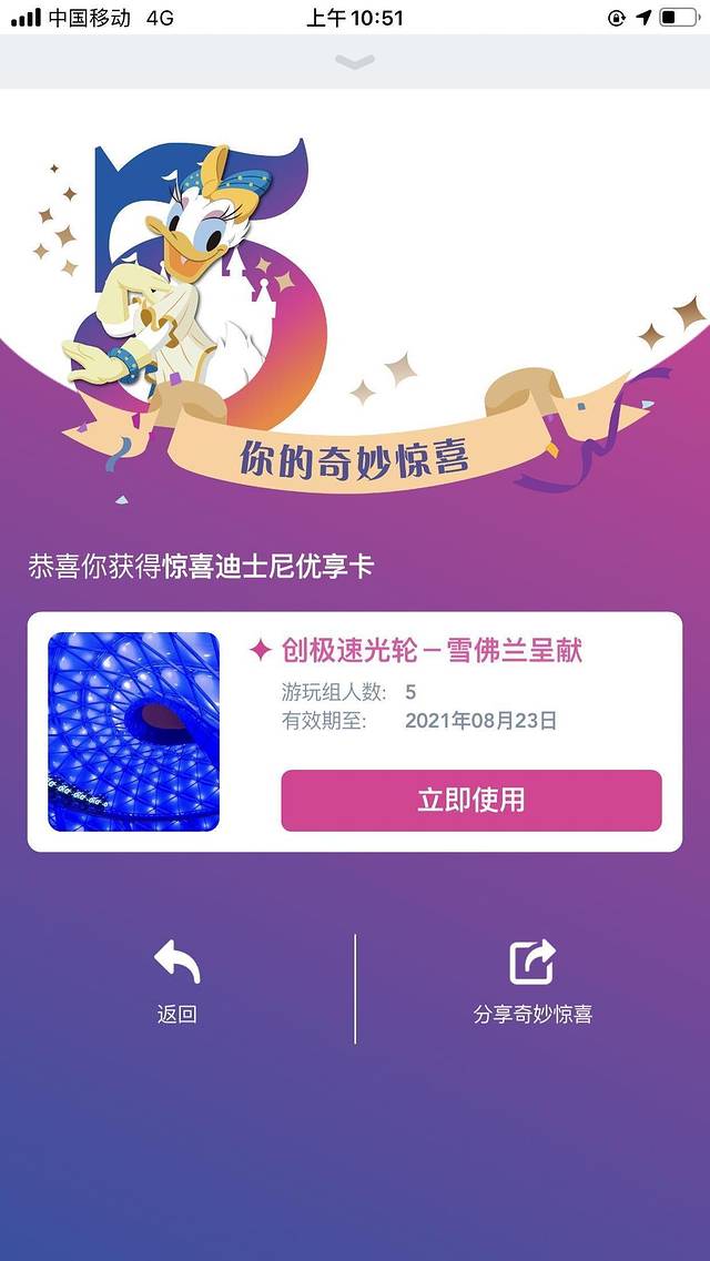 上海迪士尼五周年有很多限定惊喜,这份惊喜持续到2022年4月。进园后记得把门票绑定上海迪士尼APP就可以抽奖了,如果同行多人可以建立同行组,一起抽奖,这样如果中奖优享卡就会同时抽到。