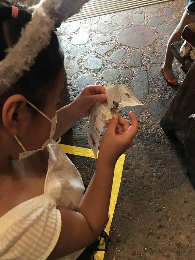 我们去了两天,娇娇抽了两次,第一次是飞越地平线的5张优享卡,第二次是抱抱龙的优享卡,哎我们家老老小小都是玩不了。其实能抽到两份优享卡已经很幸运了,但是更幸运的是第二天碰到两位很NICE的迪士尼工作人员,帮我们换了个全家都可以玩的项目,嗯应该是不能这样的吧。但是看着一脸沮丧的娇娇,工作人员说满足你吧,小朋友开心就好,很感谢他们。