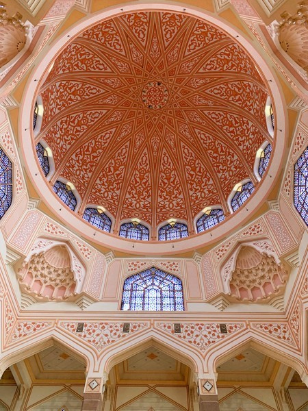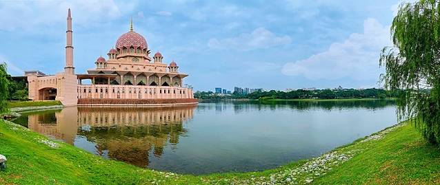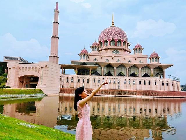 粉红清真寺(Masjid Putra),仿造摩 洛克 卡萨布兰卡 的哈桑清真寺而建,是 东南亚 地区最大的水上清真寺,因为通体粉红,因此又被称为“水上粉红清真寺”。寺内也是粉色的基调,繁杂精致的穹顶令人惊叹。注意:进入清真寺需穿着清真寺提供的玫红色长袍,一定要带帽子,同时,女性生理期禁止入内;进入祈祷大厅,必须脱鞋。一般旅行社及大多数参观的人士均从正面入口进入参观后便离去,甚是可惜,参观完寺内后,一定记得从旁边的绿化小道绕道清真寺的背面,一睹水上清真寺真容,这儿不仅能看到水上清真寺的全景,还能避开人从众随心拍照,记得防晒、防蚊。