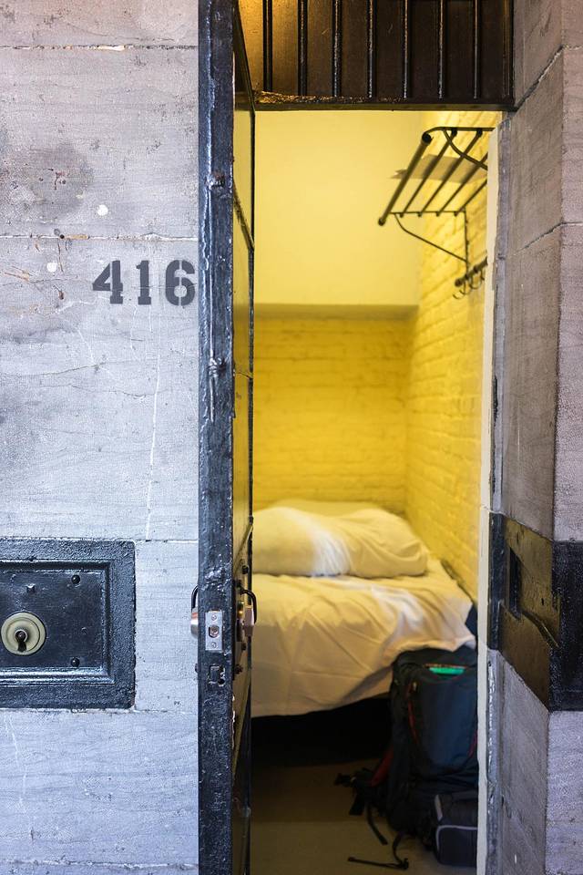 其实顾名思义,房型基本也是按照监狱原本的安置人数和大小来改造房间的,所以多人间也是被关着多人的房间,稍微好些有独立卫生间的被装修成了双人标间等,而单人间,你看到之后的照片就知道了!只容得下一个单人床的空间,狭窄又严实只有一道铁门,铁门还是上下镂空的所以其实没有隔音之说。