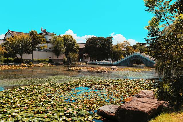 到达古镇迎面就是大片大片的荷花池,走在桥上赏着荷花,池里偶尔还会有鱼儿游动,真可惜没有带一点可以做鱼粮的零食,给它们加个餐。