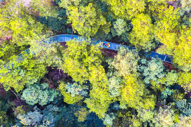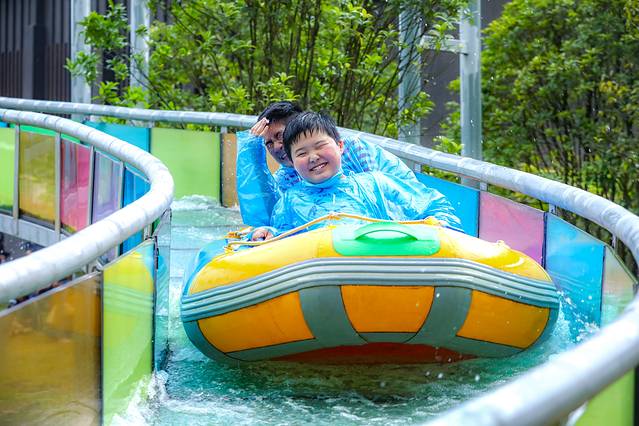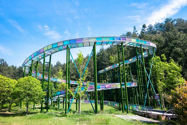 下了玻璃桥,还要走一小段下行台阶才能回到小镇。如果热了累了,或是还想更开心些,那就乘上这七彩滑道一冲而下吧!清凉刺激的感觉舒服极了!