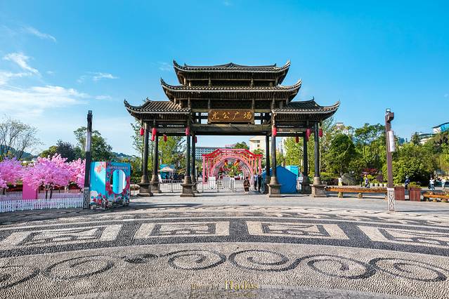 跨过尤公广场的牌楼,算是正式步入了万达小镇。上古时代与皇帝大战的蚩尤被苗族奉为先祖和战神,因此在丹寨能看到很多与之相关的元素。