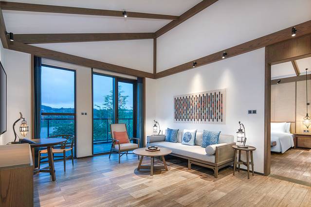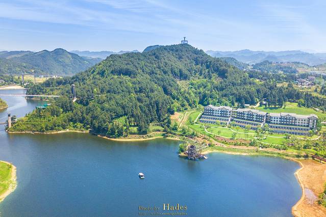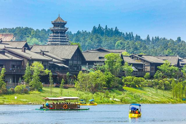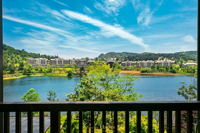 在船上或岸边,都能望见对岸被绿意环抱的酒店建筑,这便是丹寨万达锦华温泉酒店。