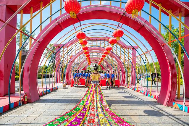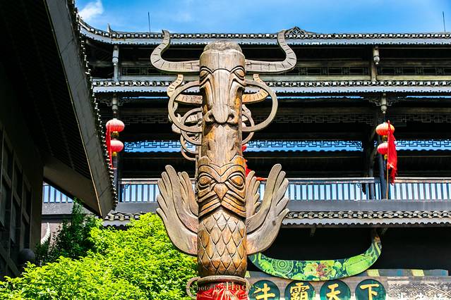 出了尤公广场,向着小镇深处步行便是尤公街。万达小镇将蚩尤元素融入街区,突出了民族历史传承及文化特色,不仅有尤公广场,还打造了这条以蚩尤元素为核心的非物质文化街区。