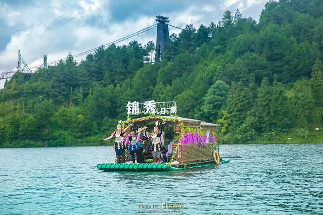 如果绕着湖游玩观赏还不过瘾,那就到码头上挑艘船,到湖中一探。湖畔的码头上有大的楼船也有小的竹排,乘上船,不仅可以一览湖光山色,甚至还可以到湖中山歌对唱!