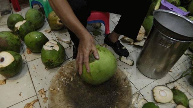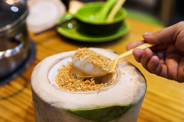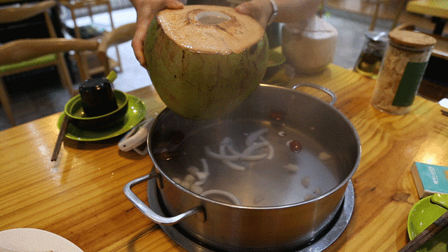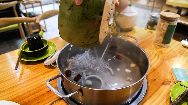 把刚砍好的椰子水倒入锅中,用大火煮开,轻轻地舀了勺椰汤,有种沁人心田的清爽雪这感觉看着就想吃,赶紧地给她们每人盛了一大碗尝尝鲜色色