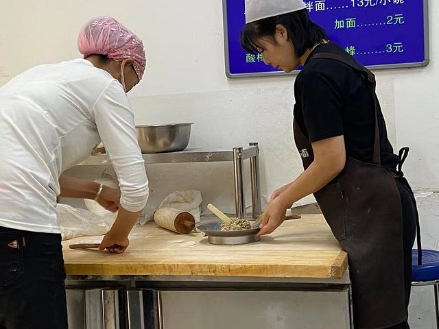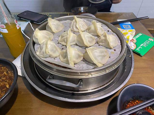第五站算是本趟打卡之旅质量最高的店了,店面门口非常小,小到你甚至走过去都可能忽略他,但内里别有洞天,这时不自量力的我忘了北方菜的份量了,一问老板娘17块钱才10个,一算我和何乖乖两人以前至少20个,点了两笼饺子,结果无意间回头看一桌上的笼子吓得立马回头退掉一笼,饺子笼子比篮球都大!上菜后首先咬开皮满足的喝口汤,牛肉汤很浓郁的牛肉香气,喝完汤后再吃肉,一个饺子非常大。干饭人也可以直接一个饺子塞嘴里享受汁水在嘴里爆开的感觉。不过吃多了应该会腻,必配冰峰解腻。