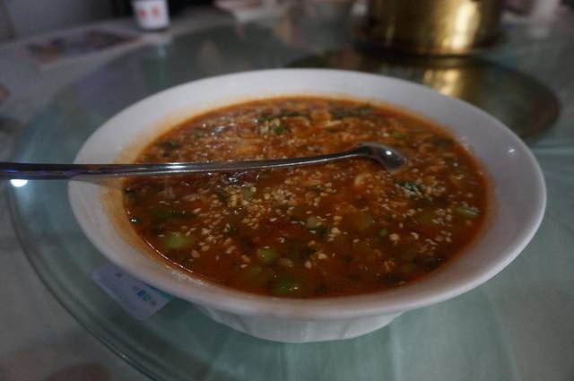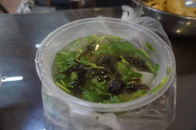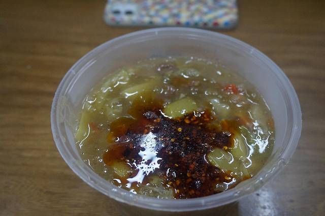 第二站何乖乖同学很拒绝这个看上去像鼻涕一样的东西,我硬着头皮尝了两口以后居然觉得还不错,里面有土豆、红萝卜、胡椒粉、肉丸还有些其他配菜,第一口尝上去有点像咖喱,给我的感觉,和张记的生汆丸子汤比同样肉丸有点咸,总体还不错,没什么出彩的地方,可能确实心里不认可这种鼻涕一样的菜
