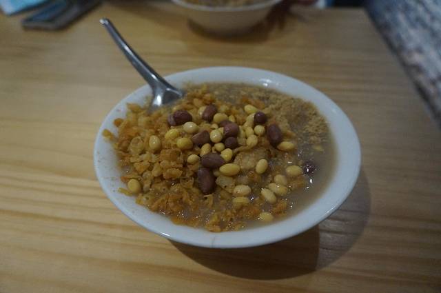 打卡小红书上比较有名的早餐,出入口温温热热,略微一点点咸味,有黄豆、黄豆粉、花生、胡椒,还有一种看上去酥酥的脆皮。然后下一根麻花下到油茶里,麻花早已煮软。一顿品尝后,何乖乖不太喜欢吃,我觉着还不错,作为早餐来说它是合格的,有营养,管饱,挺像益阳的擂茶,论美味程度的话不难吃,但确实有限。