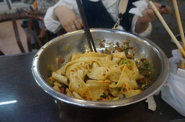 第一站从洒金桥进来看见的第一家网红点就是马二酸汤水饺,店铺还算较大,看上去浓浓的清真风格,经过商量我们只点了一碗酸汤水饺,水饺端上来后,卖相非常不错,陕西特有的油泼辣子的颜色上撒了一层芝麻,要了一口。。。。。差评,这是当时我两对视一眼后皱着眉头给出的评价。毕竟皮都没煮熟的饺子真的咽不下去,一人吃了两个闪人,口味都不太记得,不过以前在贵州吃过酸汤水饺,和马二吃的不是一个概念。也给我们洒金桥第一战吃了个瘪