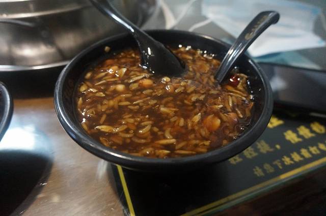 八宝粥倒是让我们惊艳了,里面有瓜子仁和山楂,和我们以前吃的八宝粥不是一个概念,不是真的有八种五谷杂粮,入口是酸甜口的,但是因为山楂的原因会有回甘,且因为瓜子仁的原因并不是甜到发腻,能够当做零食来对待的一碗粥,这是当晚唯一打包回酒店的东西,要知道10个灌汤水饺这么好吃剩了6个没吃我们都没打包