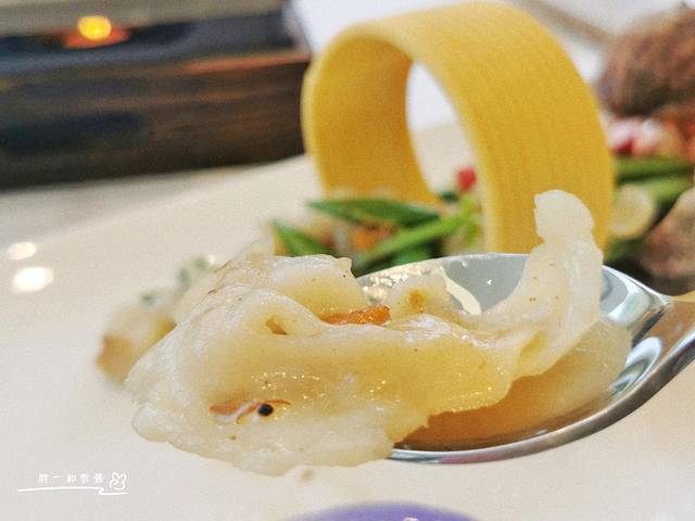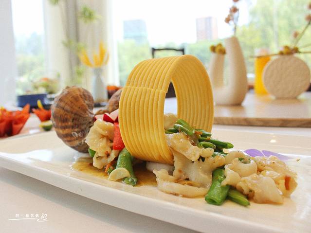 XO酱爆深海螺片,128元,海螺片与扁豆,在色调上呈现春天的勃勃生机。装盘形似江南水乡的乌篷船,写意风格讲究。海螺片有嚼劲,本博主雪酱心头大爱。