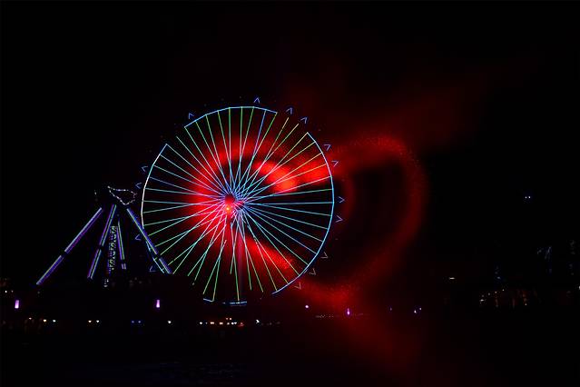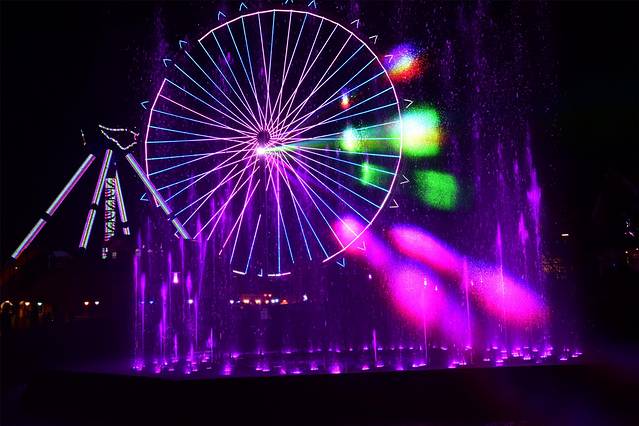 在顺德之眼旁边,音乐喷泉翩翩起舞,美妙的音乐,色彩斑斓的水幕电影,让附近的居民流连忘返,美妙的傍晚就该这样度过。