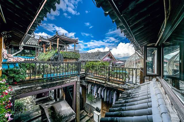 阅古楼大门口有一处网红打卡拍照地,在楼顶建造一个水池子,将天空倒映在水中,营造出古城的天空之境,看起来非常有意思!山野君首次来阅古楼客栈就感觉很好,所以每次来丽江古城旅游都会选择这家客栈。这样的观景视角真的太赞了,哪能不惹人喜欢呢?