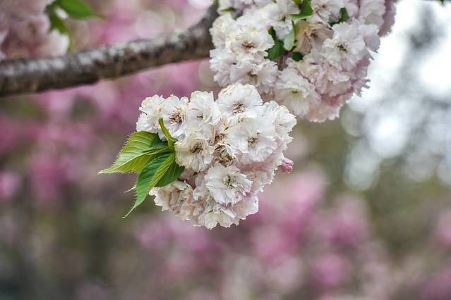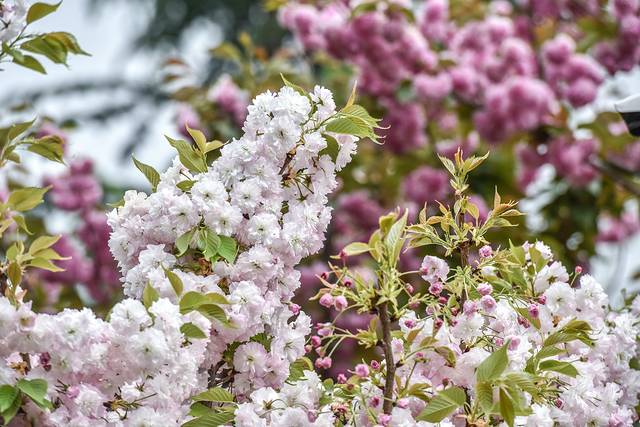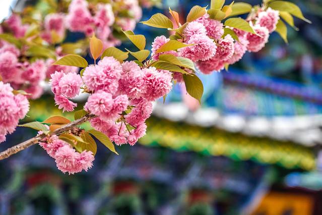 大概是黑龙潭拥有特殊气候与生态环境的缘故,樱花特别茂盛并且花朵非常大,所有花枝被花朵们压弯了。唯美的大朵樱花与纳西族建筑的背景形成对比,这画面感太赞了。