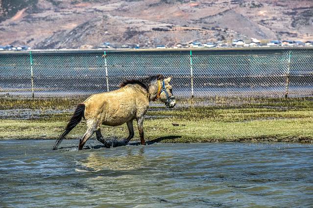 纳帕海虽然名字带有海字,但它却是一处滩涂和暗流形成的湿地,很多区域的水不深,牛或马可以随意淌河而过并抵达其岛中央的草地上吃草。不带一丝现代城市气息的纳帕海已经很好的诠释了何谓香格里拉这个概念。