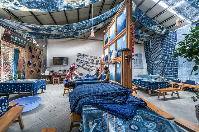 在现场生产工艺展示厅,有当地技术娴熟的工人们亲自展示扎染的自作全过程,很有意思。如果是传统文化感兴趣或是亲子游的话,这个扎染工艺制作过程一定要好好地欣赏一番。