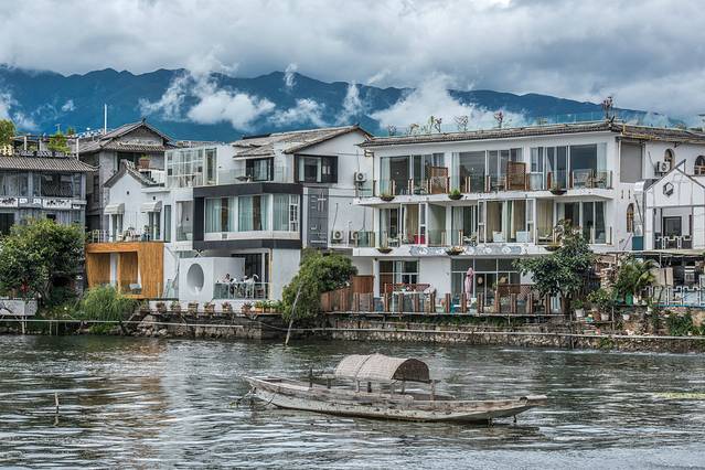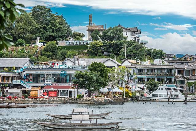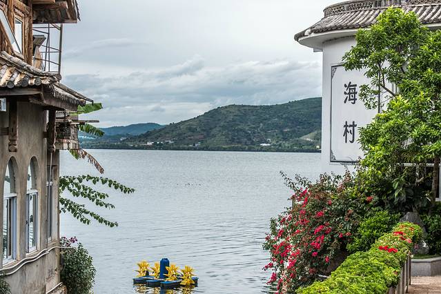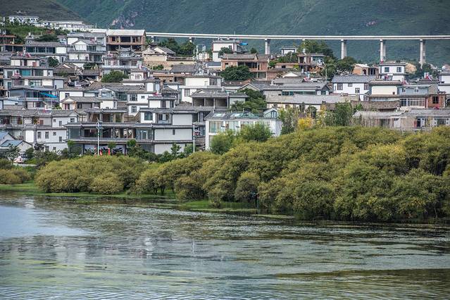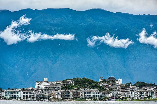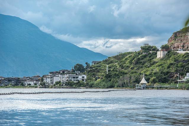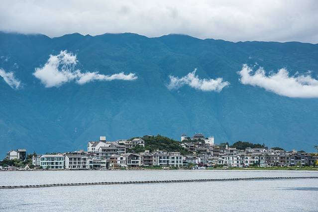 站在双廊古镇里看对面的双廊现代旅游生活区,也很有特色。艺术范的时尚风与古韵味的大理风相互映衬,形成了很有视觉冲击感的画面。