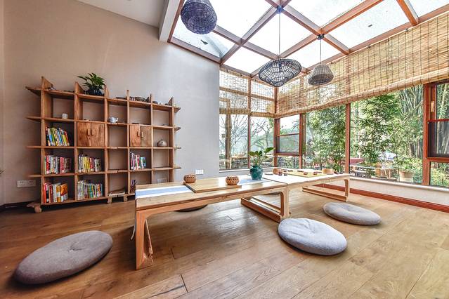 这家民宿设置前后两个门即可以到漓江也可以到兴坪古镇,而且很有风水的参考价值,正门有纳气、聚财的效果的效果,而后门则有吐故的作用。在前后门之间的中轴线上有一处可以打坐与喝茶的禅房,设计颇具匠心。