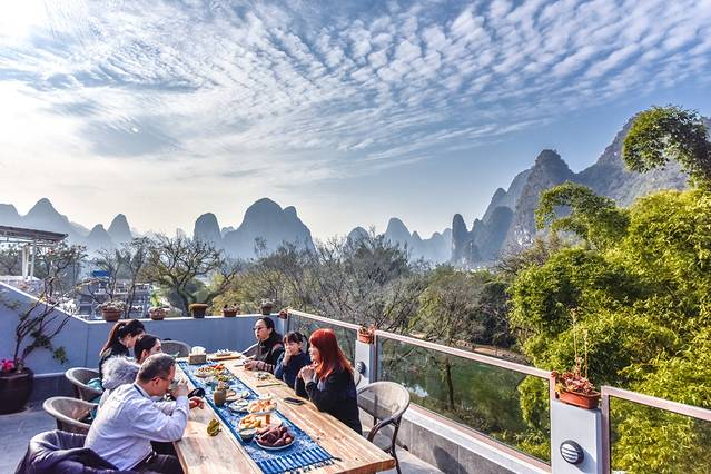 阳朔河畔小住为了满足客人们休闲观景的需求,在楼顶观景台设置一个高空茶吧处,请了当地的制茶师现场制作阳朔特色的下午茶,一边品尝当地小吃一边欣赏诗画仙境,这也太爽了吧?