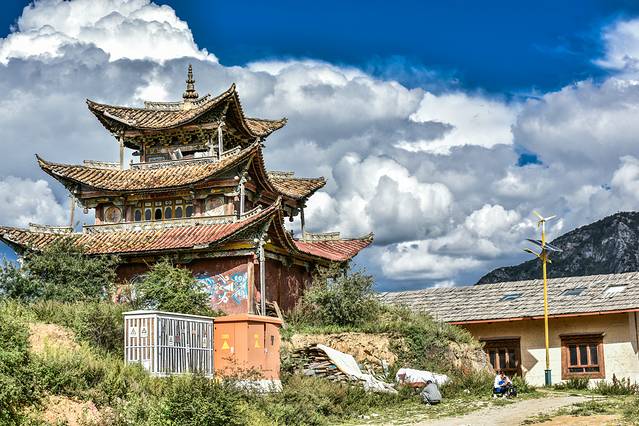 从独克宗古城前往百鸡寺的路途上最大的地标建筑莫过于木质结构的庙宇,据说是2014年幸免于火灾的古建筑物之一,现在基本上无人看管,沦为废弃的建筑。不过这个庙宇是百鸡寺与古城之间重要的地标建筑,走到这个位置差不多走过30%的路程。