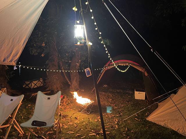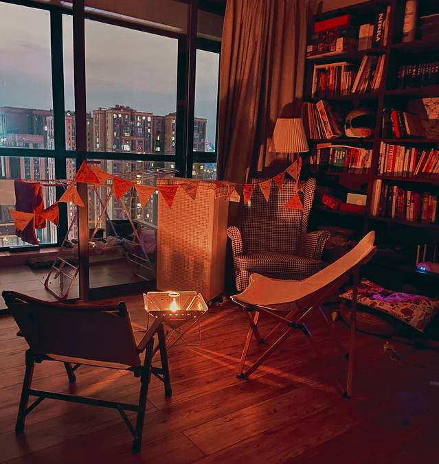 刚买来装备的时候在家也玩了一把,用氛围灯点在焚火台上,拉上彩旗支上露营椅,放着音乐。好像也挺有乐趣的。