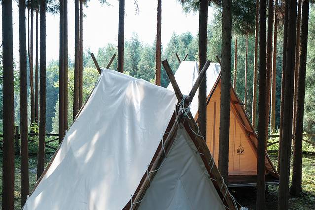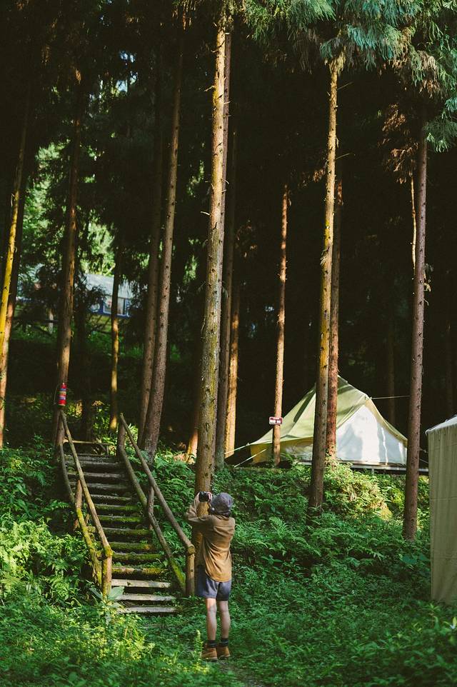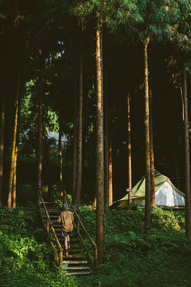 三角帐篷真的好浪漫啊!林间的树高到看不见顶,完全隔绝了暑气。清清凉凉的~