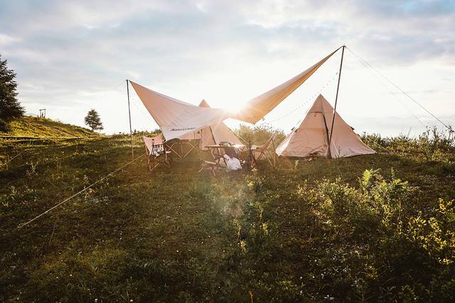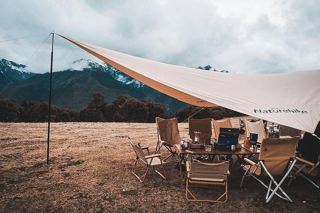 最基础的露营设备:一顶帐篷、一顶天幕、一把椅子就够了。