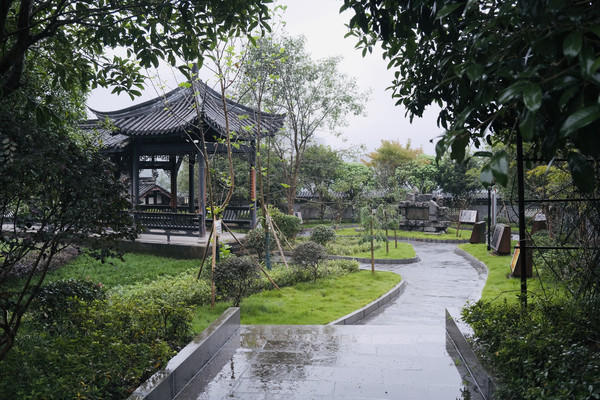 沿着红色步道穿梭在园区中。连片的茶树郁郁葱葱,感受着这一“城市后花园”。