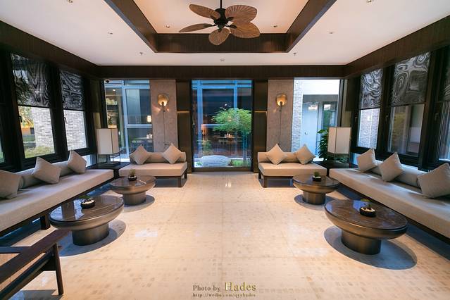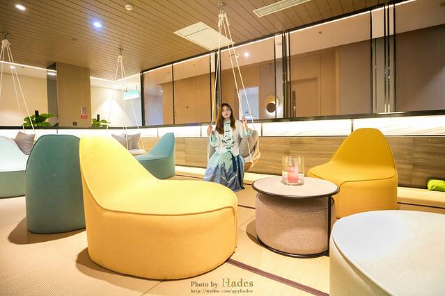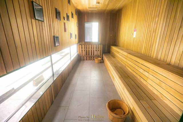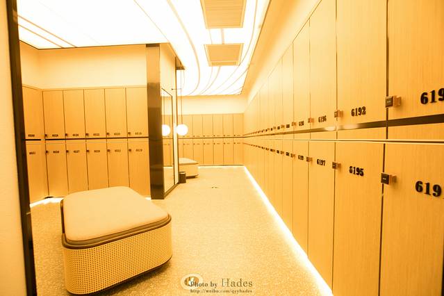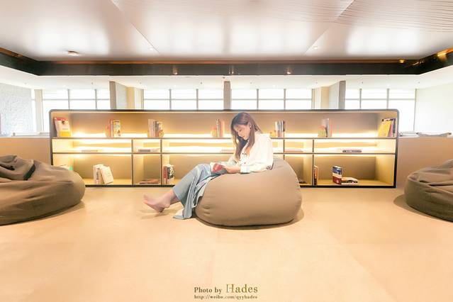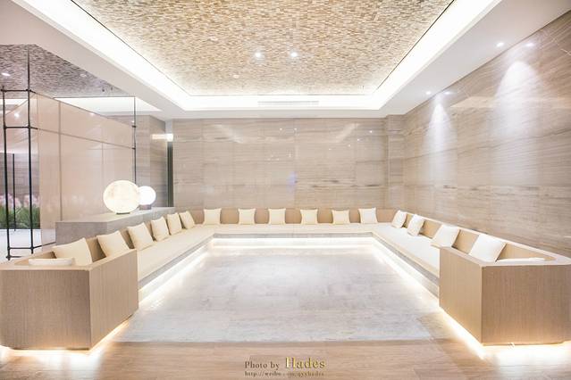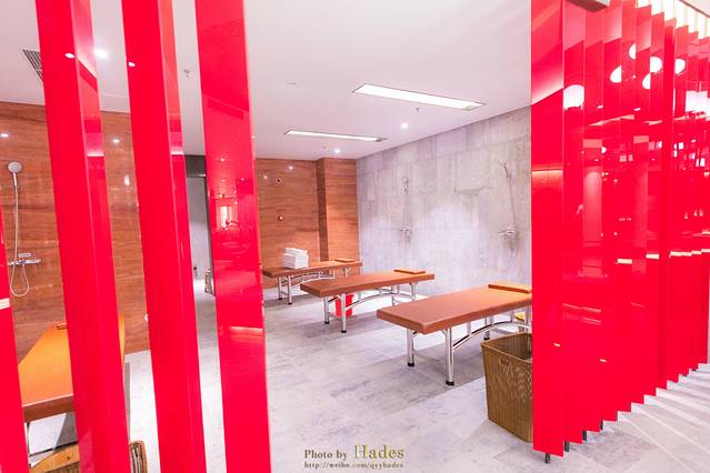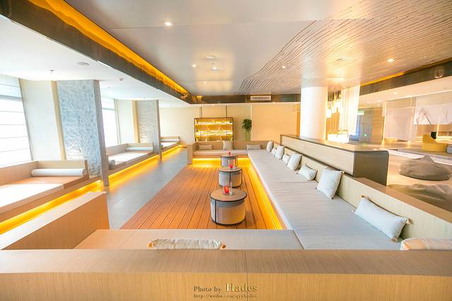 需要注意的是,二层部分是属于干区,不能穿泳衣进入,需要在一层换好浴袍再行前往。二层的座椅、沙发基本都是软包,空间大,灯光舒适,无论是拍照、看书还是小憩都很舒适。
