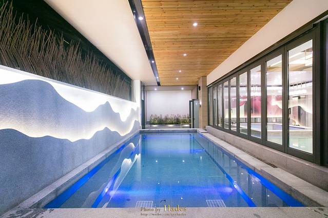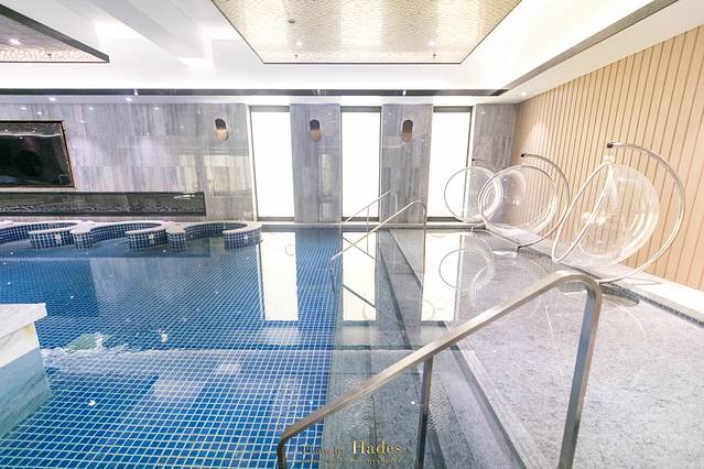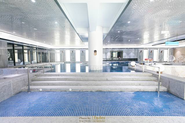 一层的公共区域分为室内和室外两部分,室内的泡池面积还是很大的,都够在里面游泳了。