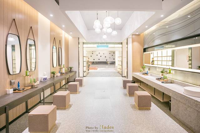 男宾区和女宾区走到尽头便是通往公共区域的入口。公共区域涵盖了臻温泉整栋建筑的1-3层。其中,一层主要是戏水区,二层主要是休闲区(干区),三层是公共温泉和私汤区等。