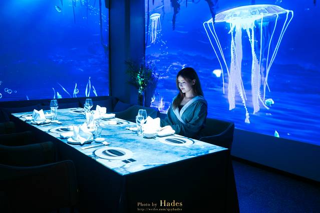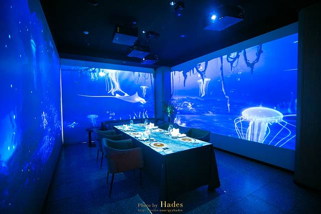这间餐厅内,四面墙壁都是全息投影的海底画面,蔚蓝深邃,开门的一刻便秒入到奇幻的海底世界,如此情境让人惊叹不绝。