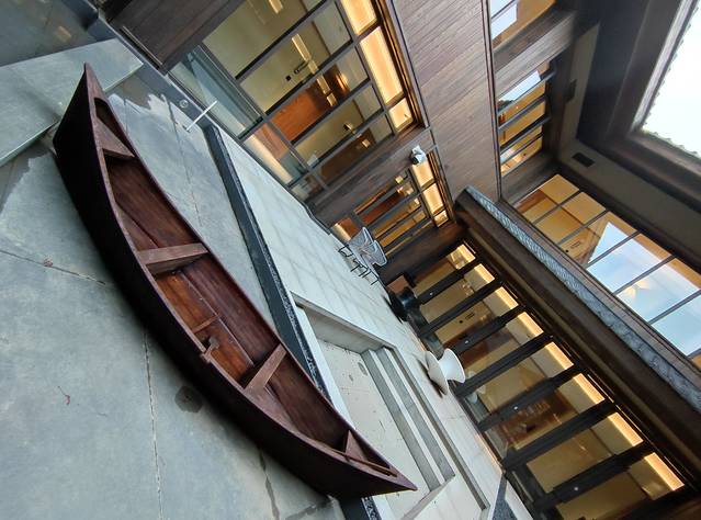 昨夜下了雨,中庭里的木船、陀螺都有积水。