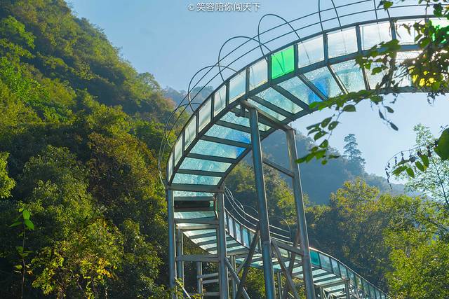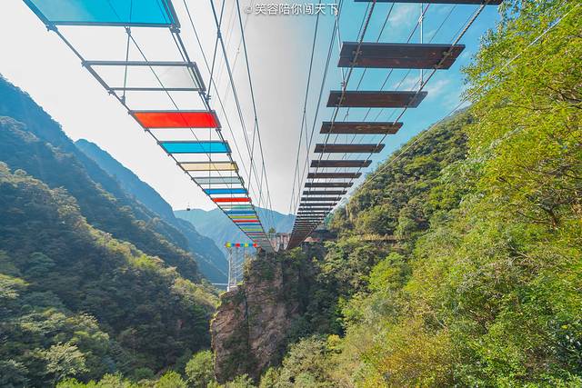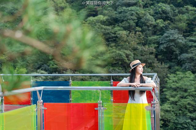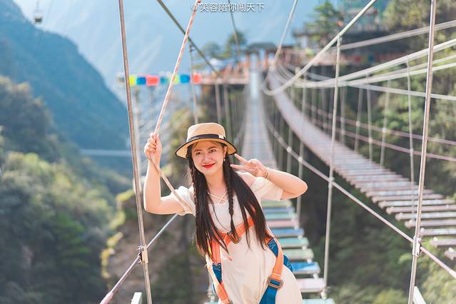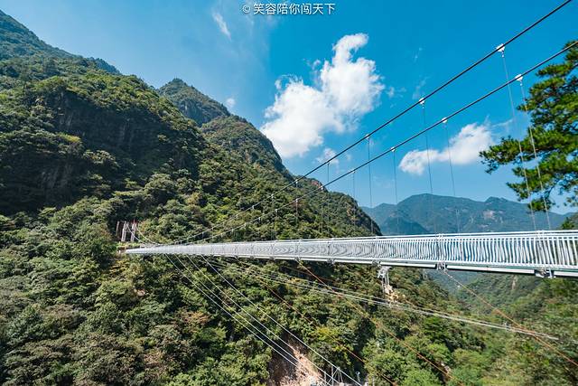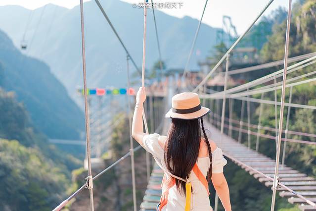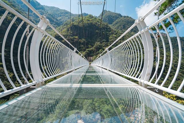 俯瞰脚下,目光所及多为悬崖峭壁,嶙峋的怪石被青葱的植被掩映。站在透明的吊桥向下看去,奇俊秀丽的峡谷风光尽收眼底,环顾四周,高山巍峨,时有阵阵清风送爽。忽然间觉得,心有猛虎细嗅蔷薇大概也是如此。