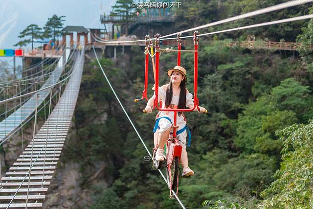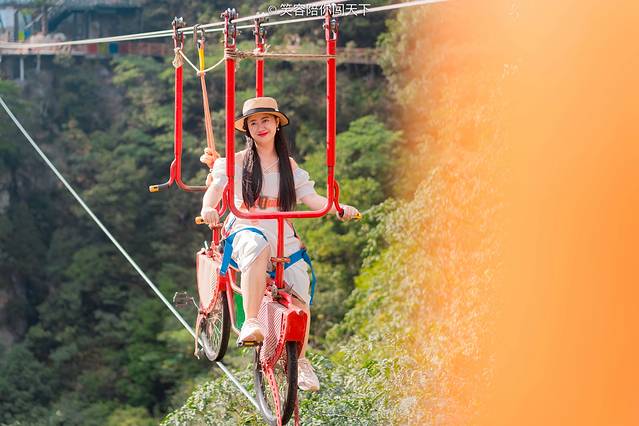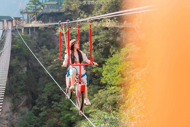 一路走走停停,终于抵达了顶端,几乎大部分的高空项目都集中在这里了,这里有网红桥,有高空自行车,有天空之,有悬崖秋千,每一项都在刺激着我的神经。网红桥之前体验过了,对于日常喜爱玩刺激项目的我来说,在上面简直真可以用健步如飞来形容,不过看到我后面的游客,真的是“闲庭漫步”,不过她是给吓的,低头就能看到峡谷,风儿拂面,桥面摇晃,对于胆小的人来说,还是有些可怕的。