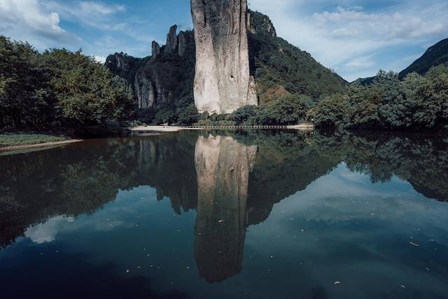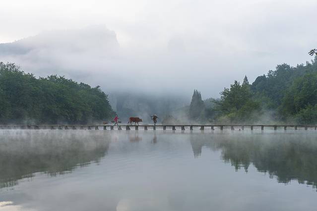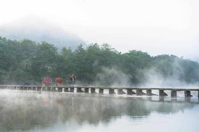因宋代理学家朱熹曾栖于此而得名。这里是仙都最出片的摄影拍摄点,很多国际获奖的大片都是在这里诞生的。清晨四五点开始,朱潭山就会迎来一个属于老法师们的游园早高峰。当石板桥上水汽翻腾,背景是不远处的鼎湖峰,在仙气十足的氛围里,如有一两个农夫或挑着担子,或牵着老牛,跟着一条狗……如同从中国画里活了过来的画面感。来自各地的摄影师,带着长枪短炮,在最佳机位架好器材,在咔擦咔擦的快门声中,记录下的不止是这山水的柔情,仿佛还穿越了宣纸和时光,和数百年前的山水大家来一场关于艺术的对话。