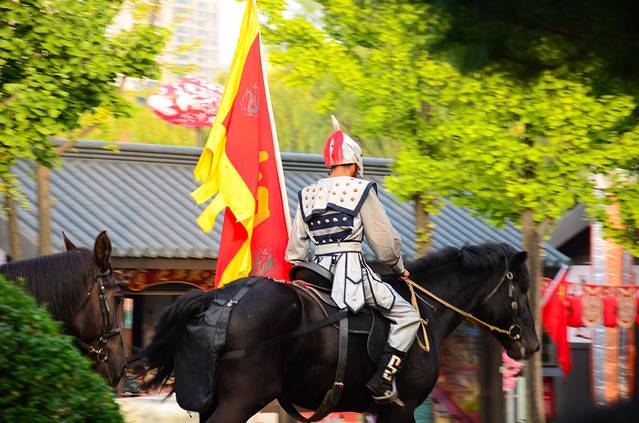 节假日期间,大唐芙蓉园都会有节目表演;一抬头,就能近距离的看到骑着高头大马的士兵在敲锣打鼓声中从你身旁走过;