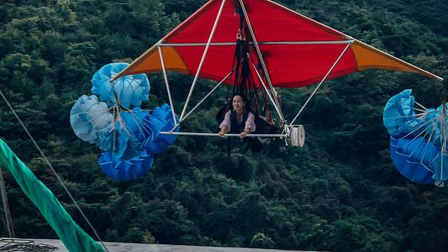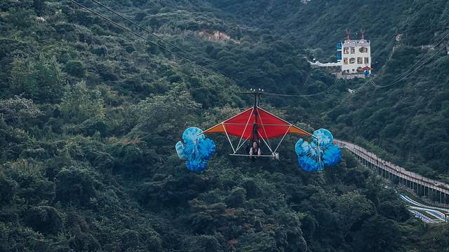 4.滑翔翼:滑翔翼和冰洞是在一起的,从冰洞出来可以直接上滑翔翼。滑翔翼就是一个挂在索道上的大风筝,看着刺激,其实非常温和,非常方便。而且,滑翔翼飞起来的感觉,整个人就真的好像在飞翔。那感觉跟成仙了一样。