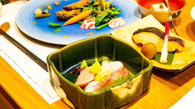 旅馆提供的餐食是用大分别府当地的食材制作的日西融合式怀石料理。滋味浓郁的新鲜食材经精心烹制后,风味诱人,美味无比。