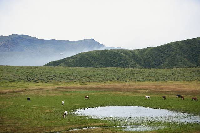 阿苏的著名景点,一个火山口旁边的大草原,总面积78. 5万平方米,雨水形成的水池是一道美丽的风景。