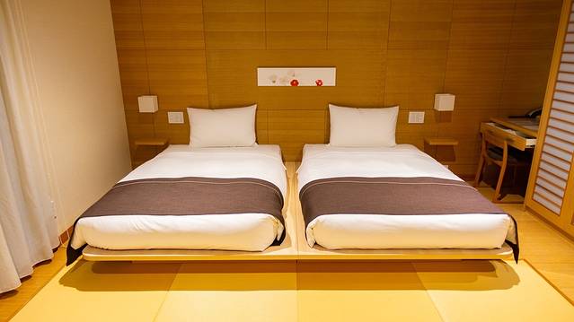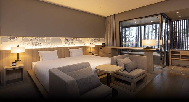旅馆内的装潢以竹艺取胜,营造出沉静幽然的氛围。客房是木质日式房间,适宜放松身心。